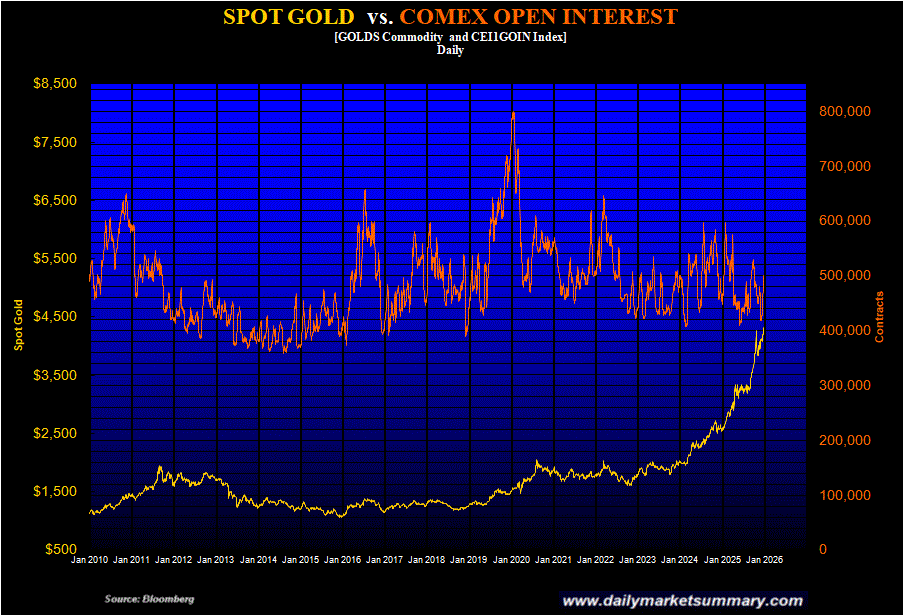Otevřený zájem (open interest) o zlato na burze COMEX vzrostl v pátek o více než procento na 499 546 kontraktů a včera podle indikací vystřelil o více než 6 procent. Vstupují spekulanti konečně na trh se zlatem? Pokud ano, mají před sebou ještě dlouhou cestu, než dosáhnou úrovní z historických býčích trhů.