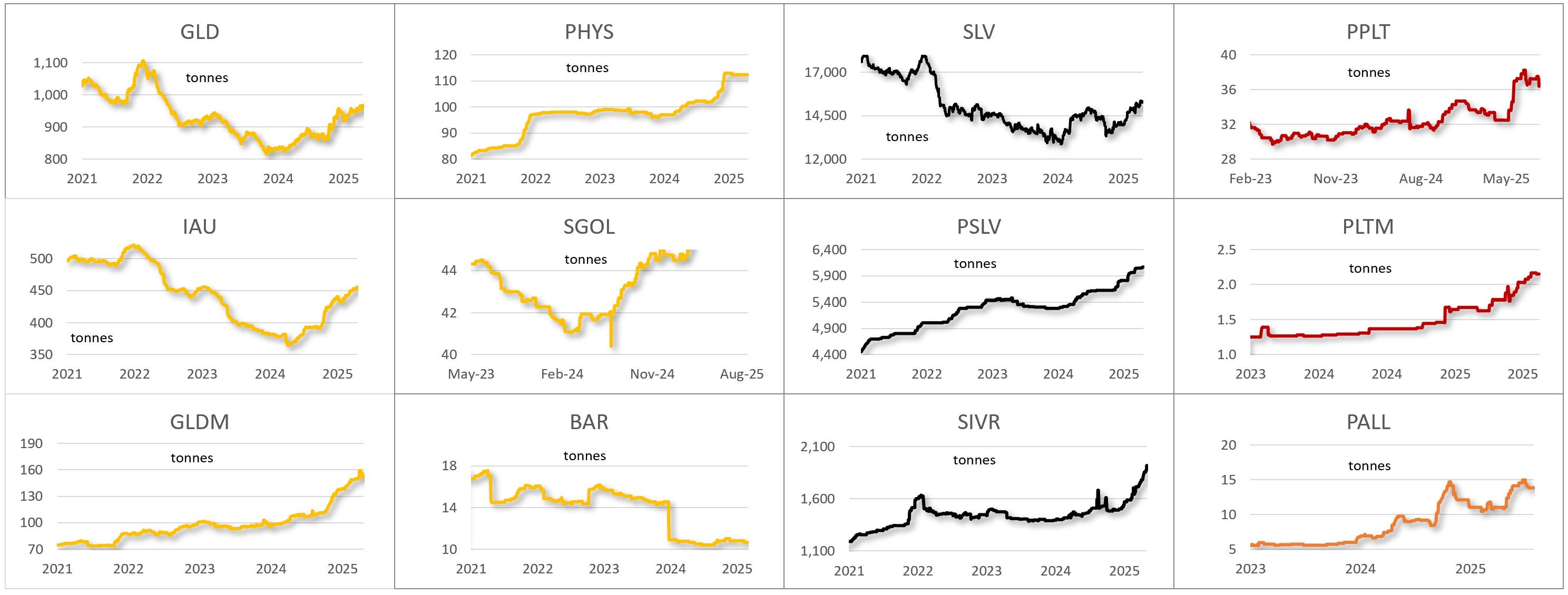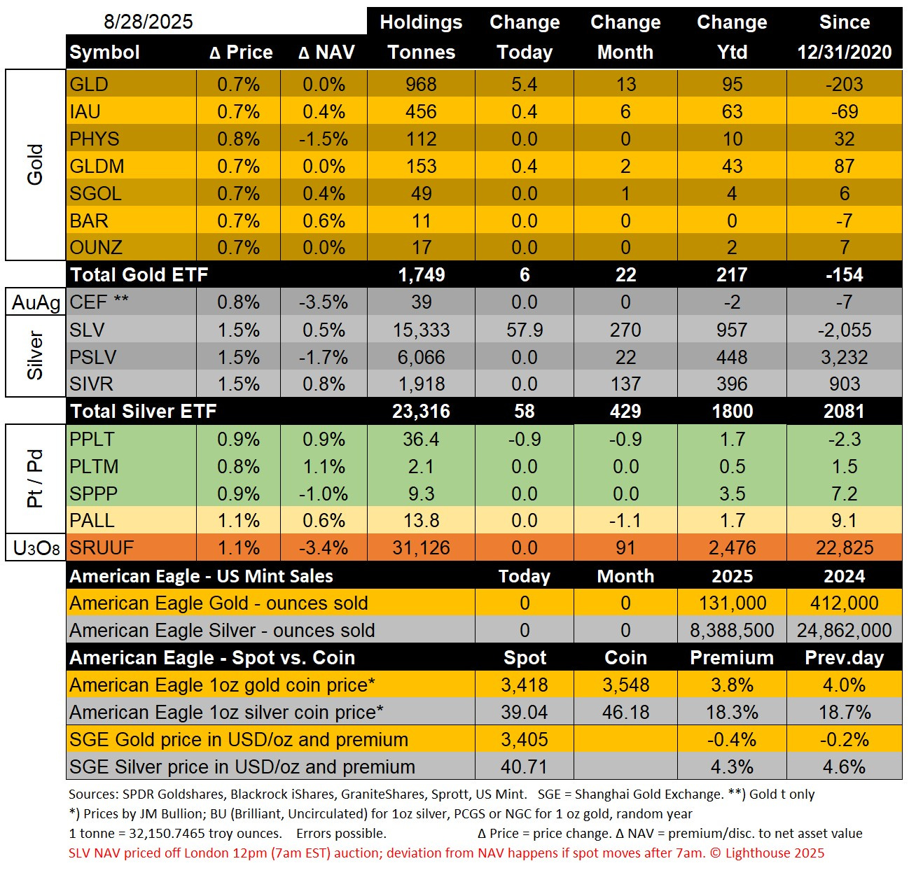 GLD přidal největší množství zlata od začátku srpna (přes 175 tisíc uncí zlata). Fondy GLDM a IAU přidaly také malé množství zlata, a fond SGOL přidal asi 900 tisíc jednotek, ale zatím nedošlo k nákupu. Celkově tedy poptávka po skrze burzu v USA začíná znovu růst.