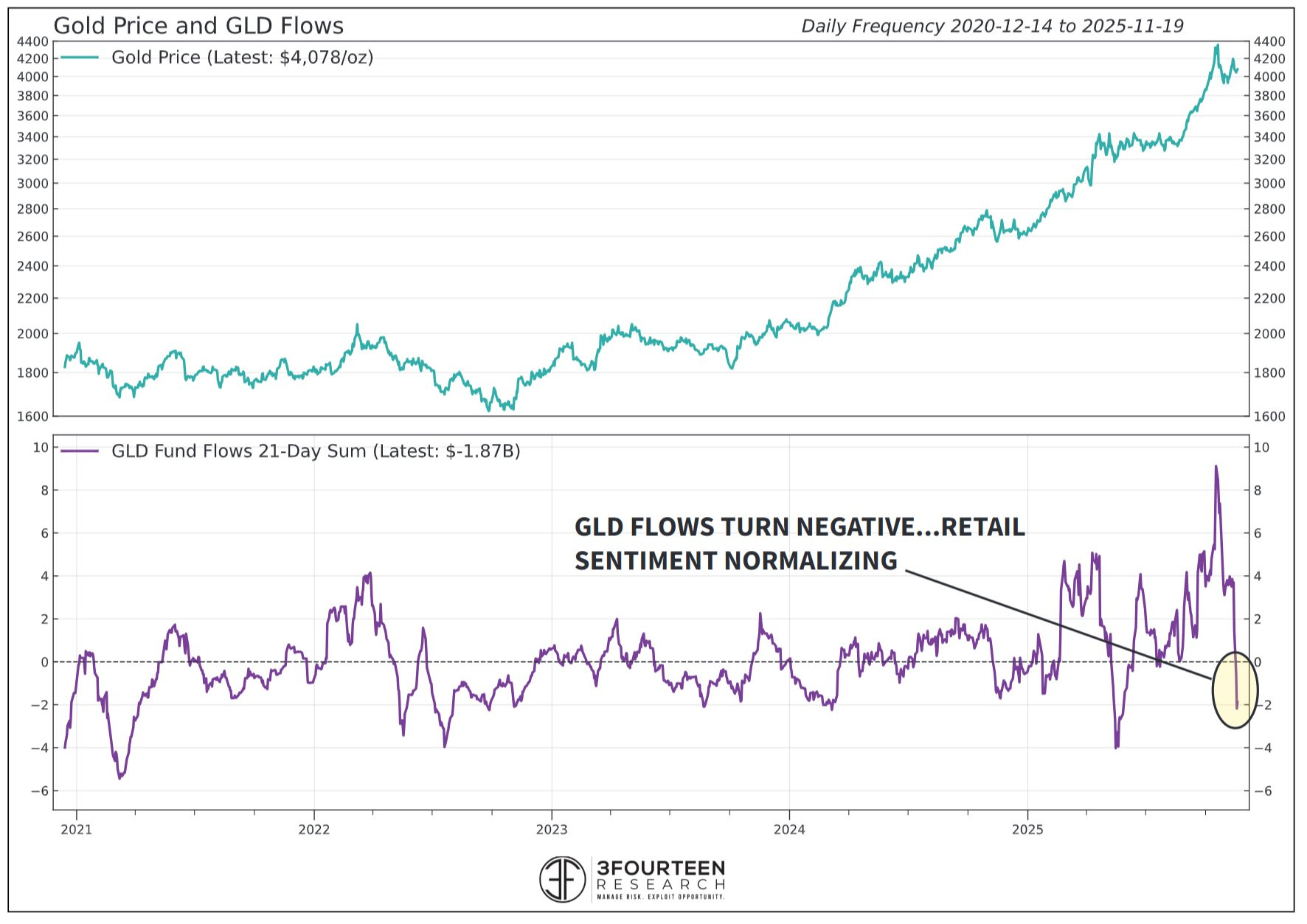 “Nálada drobných investorů vůči zlatu se normalizovala… Dno této korekce u zlata je dosaženo, nebo se k němu blíží.“ Warren Pies, 3FOURTEEN research