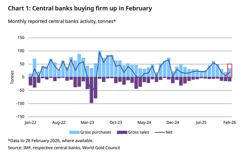 Globální centrální banky v únoru nakoupily dalších +19 tun zlata, čímž zaznamenaly již 23. po sobě jdoucí měsíc čistých nákupů. Tento výsledek navazuje na +6 tun v lednu, takže celkové letošní nákupy dosahují +25 tun.