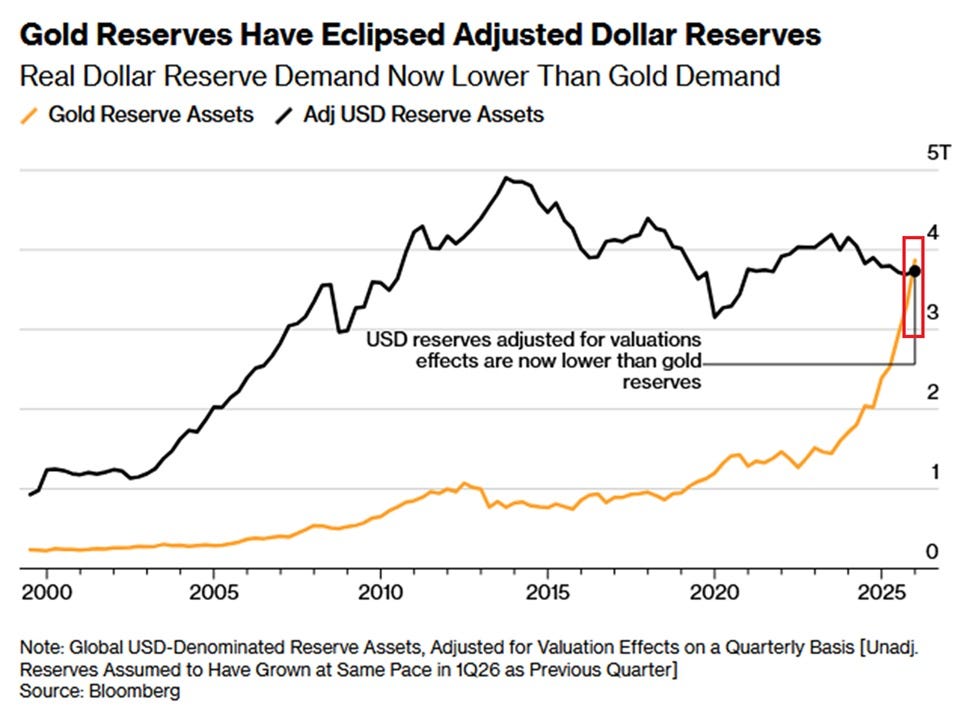 Zlaté rezervy centrálních bank poprvé v historii překonaly hodnotou (po úpravě o ocenění) rezervní aktiva v amerických dolarech.