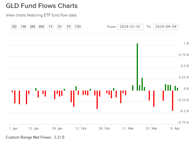 Od počátku roku zlato v dolarovém měřítku přidalo 16% (v korunách daleko více) a přitom z hlavního burzovního instrumentu na zlato (GLD) odteklo za tu dobu více než $3 miliardy. Jen za duben je nárůst ceny v dolarech 7% a peníze z GLD stále odtékají.