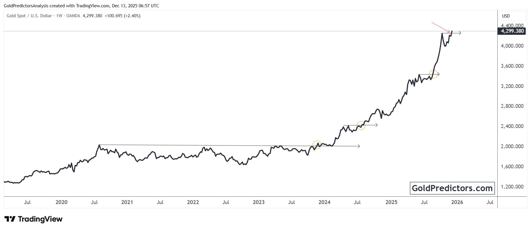 Zlato právě zaznamenalo své historicky nejvyšší týdenní uzavření, když skončilo na úrovni 4 300 USD, a potvrdilo tak pokračování průlomu. Býčí momentum zůstává silné i s výhledem směrem k roku 2026.