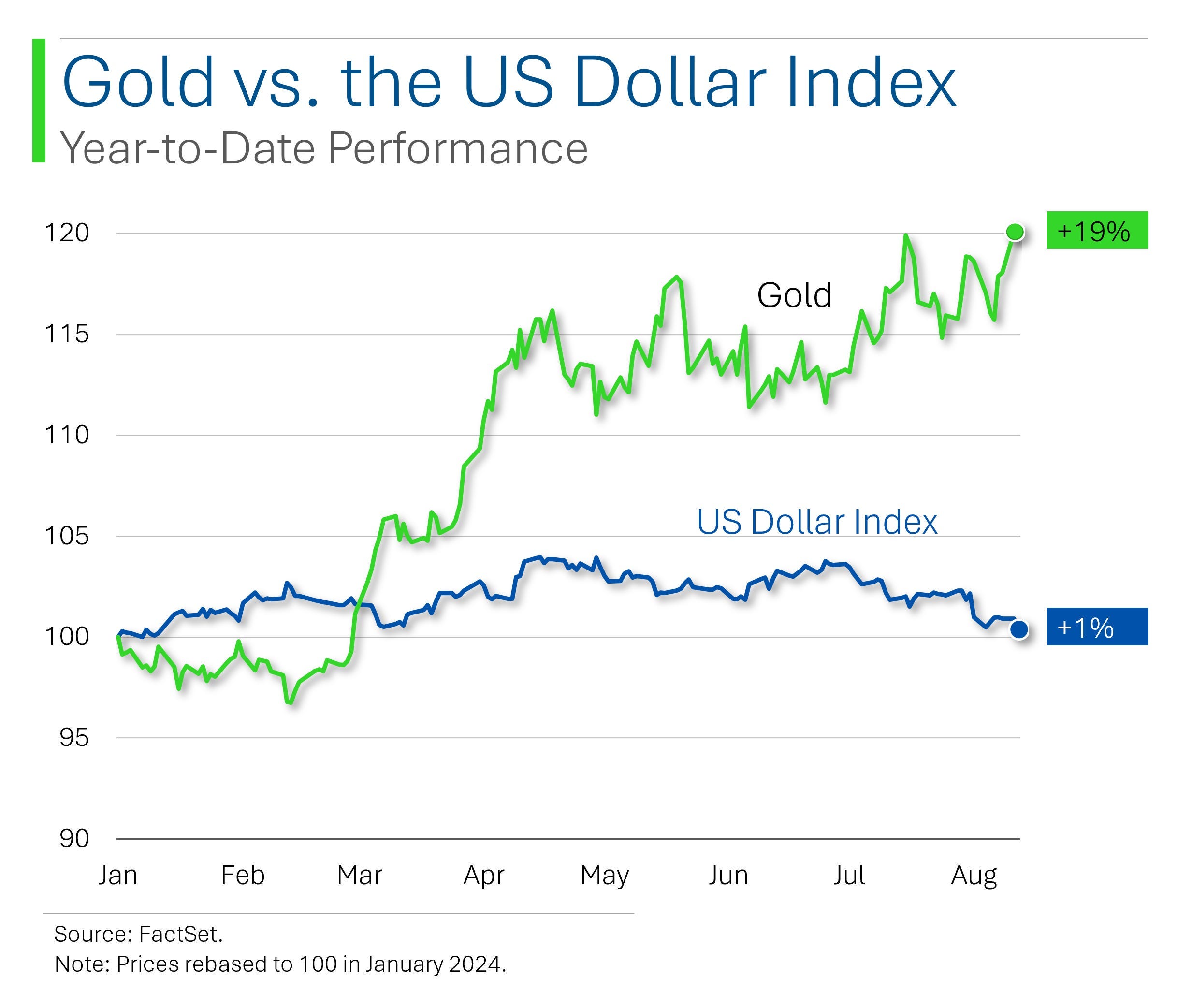 Pro mnoho lidí zůstává hlavním tématem inflace, protože trh se stále nedokáže shodnout na úrovni snižování úrokových sazeb, které nás čekají do konce roku. Přesto zlato výrazně překonalo index amerického dolaru v roce 2024.
