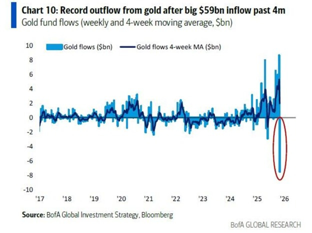 Zlaté investiční fondy předminulý týden vykázaly rekordní čistý odliv ve výši 7,5 miliardy dolarů, když investoři vybírali zisky po historické rally na trhu se zlatem. Tento vývoj následoval po rekordním přílivu 8,5 miliardy dolarů v předchozím týdnu. Celkově fondy zaměřené na zlato během posledních čtyř měsíců přilákaly kapitál v hodnotě 59 miliard dolarů.
