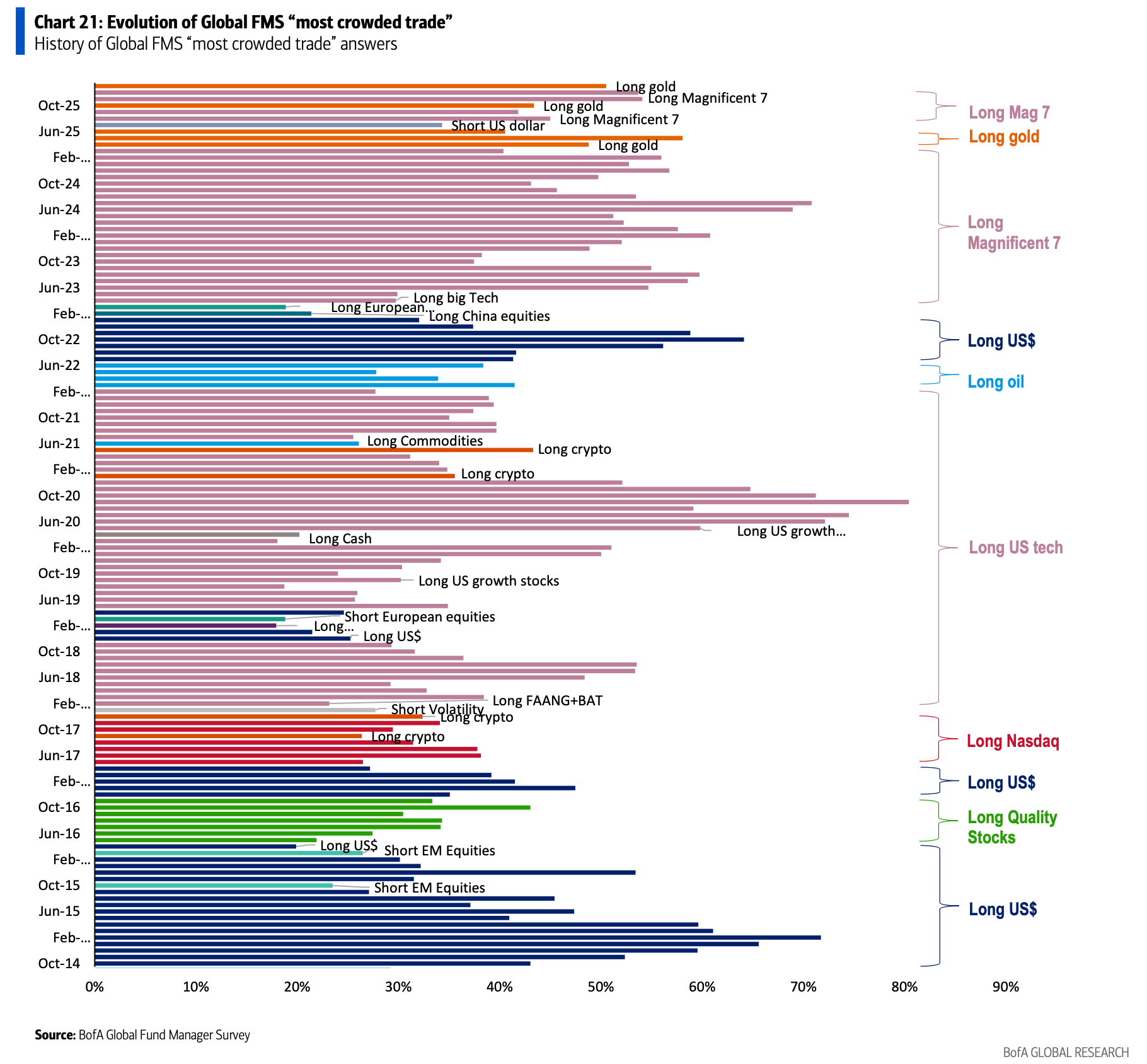 Podle měsíčního průzkumu Global Fund Manager Survey Bank of America je zlato v současnosti nejvíce přeplněným obchodem na trhu.