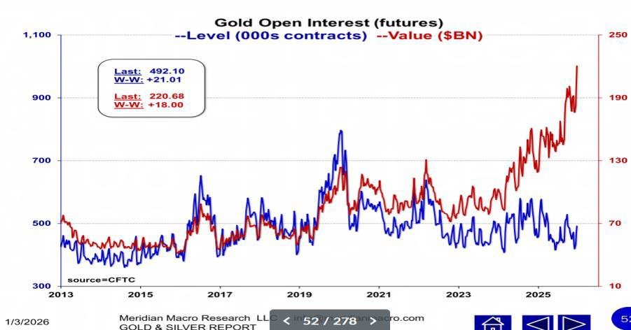 Zdá se, že západní spekulanti mají stále poměrně velký prostor pro navyšování svých pozic ve zlatých futures, protože otevřený zájem (open interest) na burze CME je aktuálně pouze 482 412 kontraktů – což je historicky relativně nízká úroveň. Dlouhé pozice kategorie Managed Money (hedgeové fondy a obchodníci s komoditními futures) ve výši 160 000 kontraktů jsou výrazně pod maximy dosaženými při vrcholu ceny zlata v polovině roku 2016 (zhruba 300 000) i při vrcholu v roce 2020 (téměř 280 000 kontraktů).