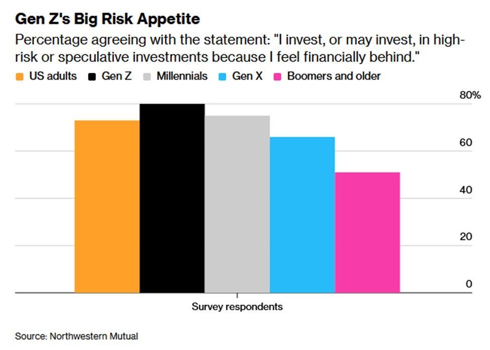 80% investorů z generace Z říká, že investují nebo plánují investovat do vysoce rizikových spekulativních aktiv, protože mají pocit, že finančně zaostávají. Je to nejvyšší podíl ze všech generací. Následují mileniálové s 75%, generace X s 66% a boomers a starší s 51%. Celkový průměr mezi dospělými v USA je 73%.