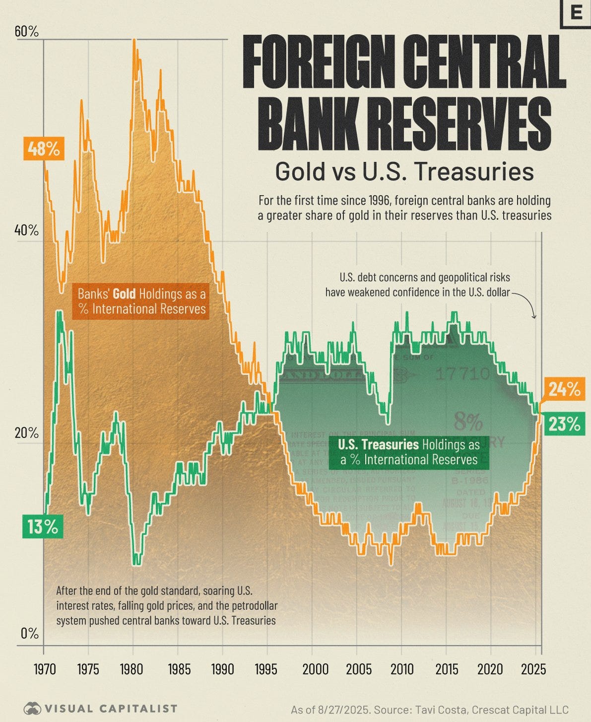Kombinované zlaté rezervy centrálních bank nyní poprvé přesahují americké pokladniční poukázky (UST) poprvé za tři desetiletí. Zlato se vrací do systému a nahrazuje cenné papíry denominované dolary.
