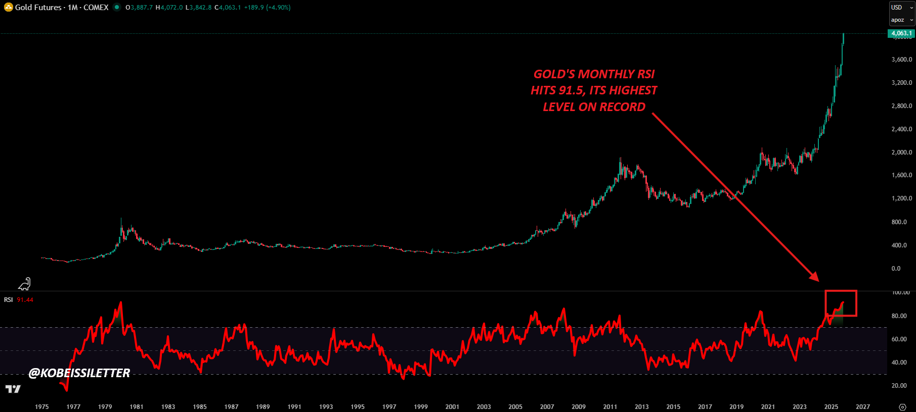 RSI zlata dosáhl 91,5, což označuje svou nejvíce „nadměrně nakoupenou“ úroveň. Ani 2001, 2008, nebo 2020 neviděl ukazatel nad 90: