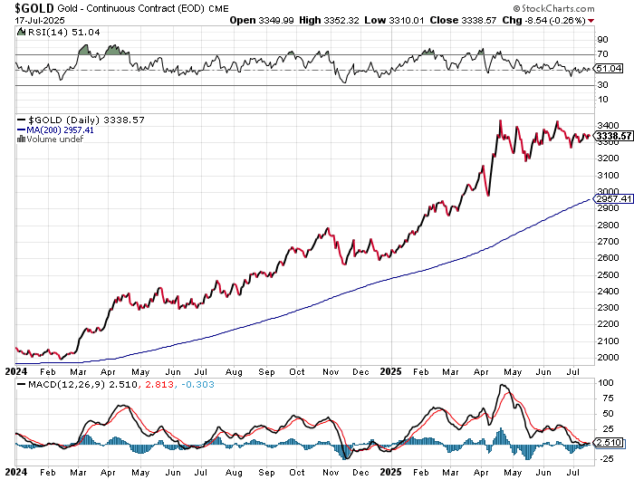 Sezónnost je dána poptávkou po špercích, která typicky ožívá v červenci a pokračuje až do začátku dalšího roku. Čínští spekulanti na futures se ve velkém opět vrátí, jakmile se zlato vymaní z aktuální konsolidační zóny. Může k tomu dojít brzy – zlato dnes (o 20 USD výše na 3 358 USD) je jen 74 USD (2%) od svého historického maxima při zavírací ceně.