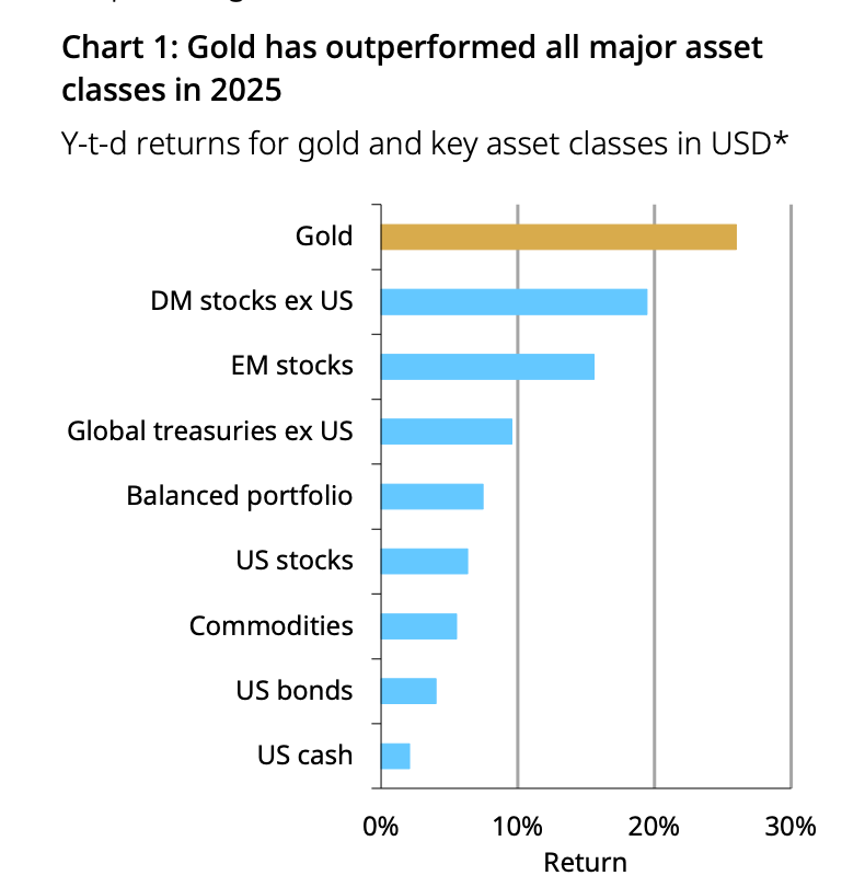 Zlato letos zhodnocením překonalo všechny hlavní druhy aktiv, jak je vidět z tento týden publikovaného grafu World Gold Council (pro srovnání - spořící účet vidíte jako poslední proužek):